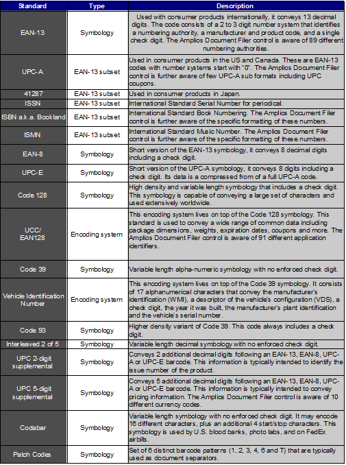 The Amplios Document Filer checks each document it processes for a linear bar code. This is a list of all the currently supported bar code types. If a supported bar code is found when a document is processed, the information in the bar code is used to rename the file. You can accept the automatic renaming done by the program or you can use a Regular Expression to customize how you want your files named based on the bar code information.