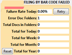 When documents are processed they will either be filed successfully based on the bar code or moved to a problem folder. This percentage tells you how often the documents are not being filed successfully. Failure will most often be due to a problem with reading of the bar code. You may be able to make adjustments to some of the bar code inspection parameters to improve the success rate. For example, you may be able to adjust the contrast between the printed information and the document background to make it easier to find the bar code. It can be that the information you need to successfully file this document can be easily read by a human being but is difficult for the program to read. The original document may be dirty, torn, or poorly printed. Someone may have written over the bar code. For the few documents that are not processed successfully, the best solution may be for a person to manually review and file these documents once per day.