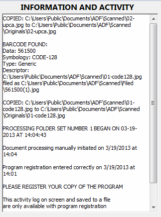 If your copy of the program is registered, you will see all program activity logged in this section of the screen. You can scroll through the log to view everything that has happened. Registered copies of the program will also create and maintain a log in the same folder as the program. A different file is created for each month in which the program is run and files are processed. The file for March of 2013 would be named 2013-03 Log.txt. You can view the log at any time by clicking on the File menu and selecting Open Log File.